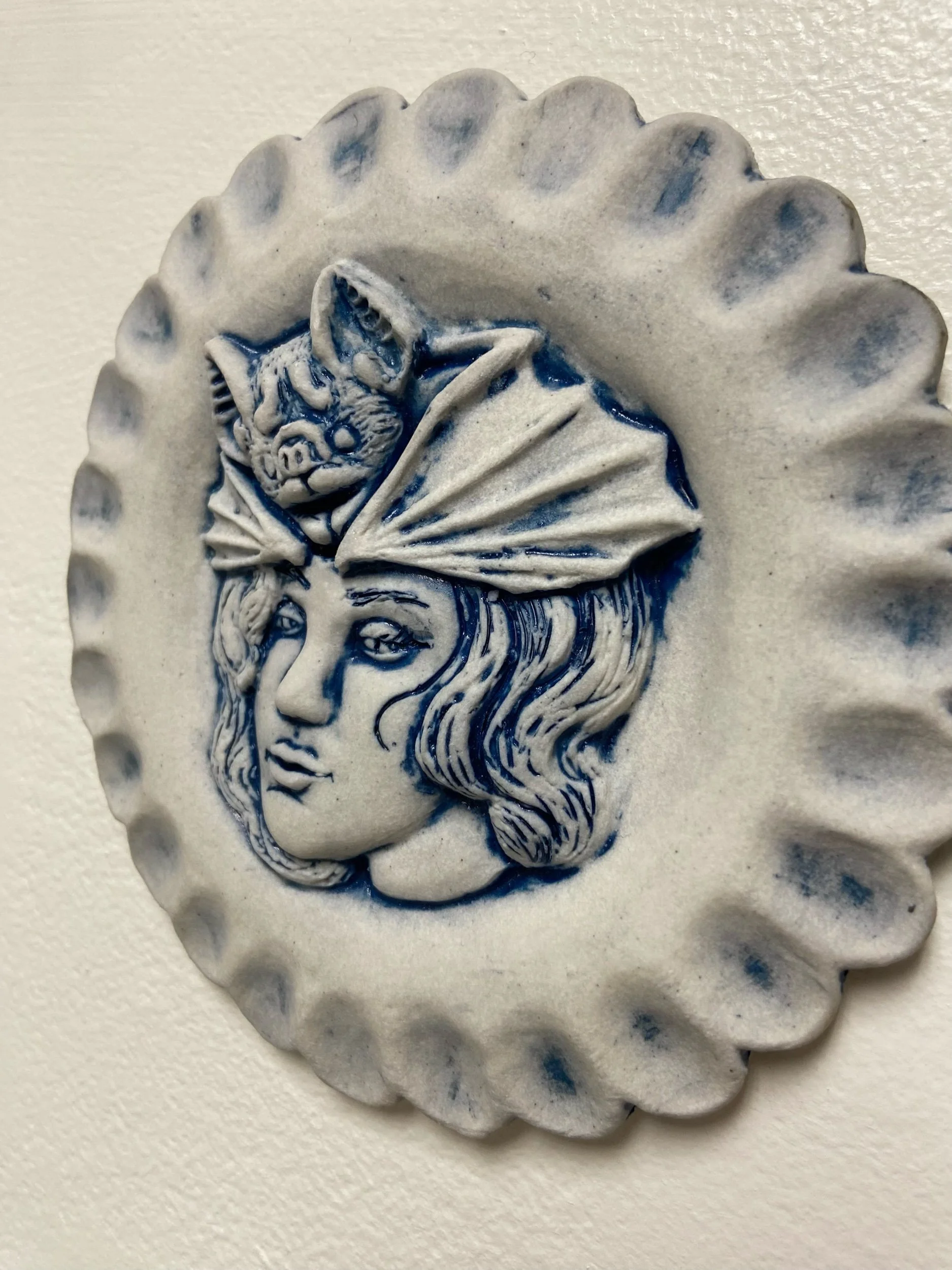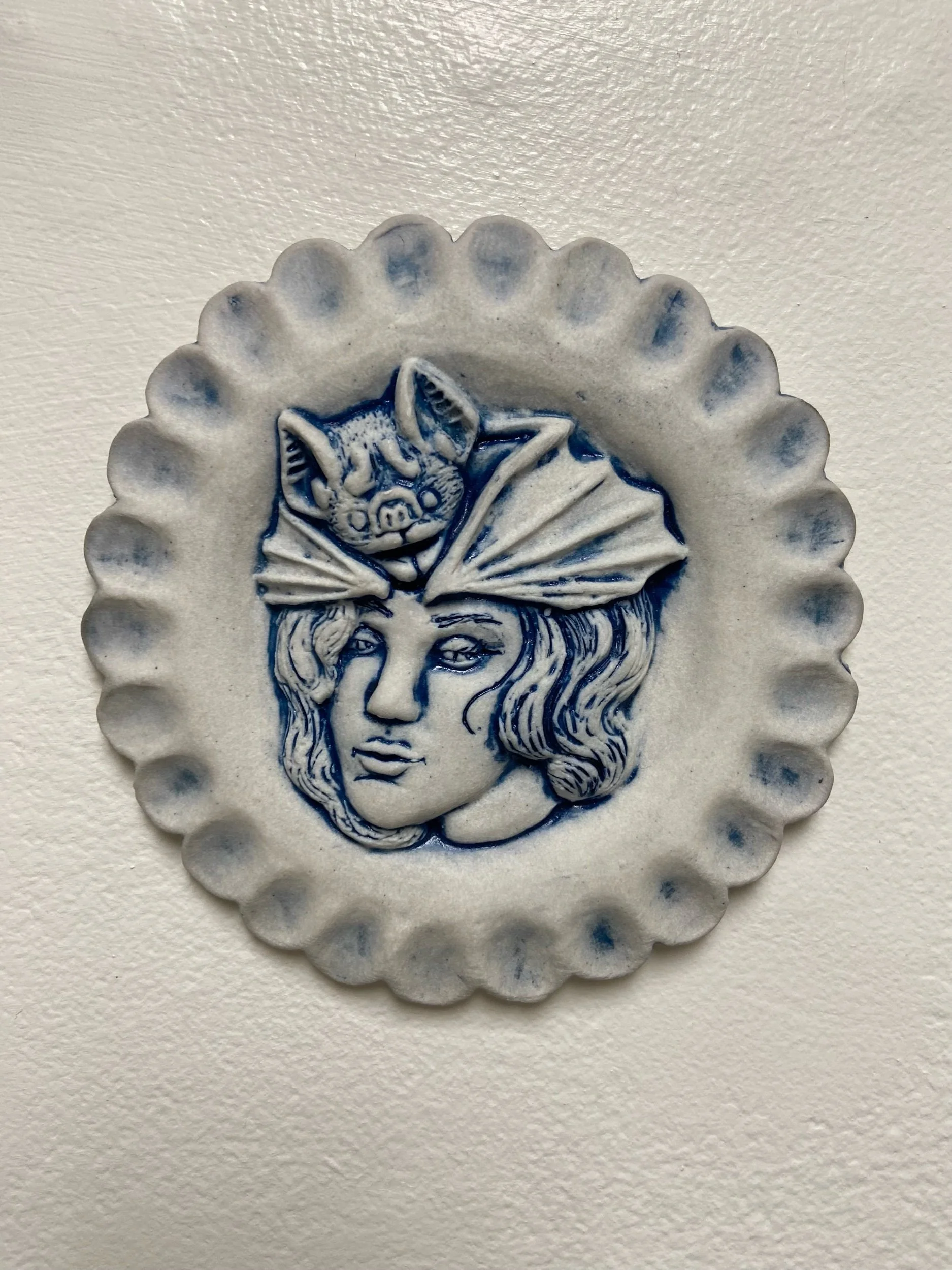 Store › Bats For Brains Lady 07 Image 1 of 2 Image 2 of 2 Bats For Brains Lady 07 $90.00 Cone 10 Porcelain wall hangings.5” Dia. x 0.5”H Add To Cart Added! Cone 10 Porcelain wall hangings.5” Dia. x 0.5”H