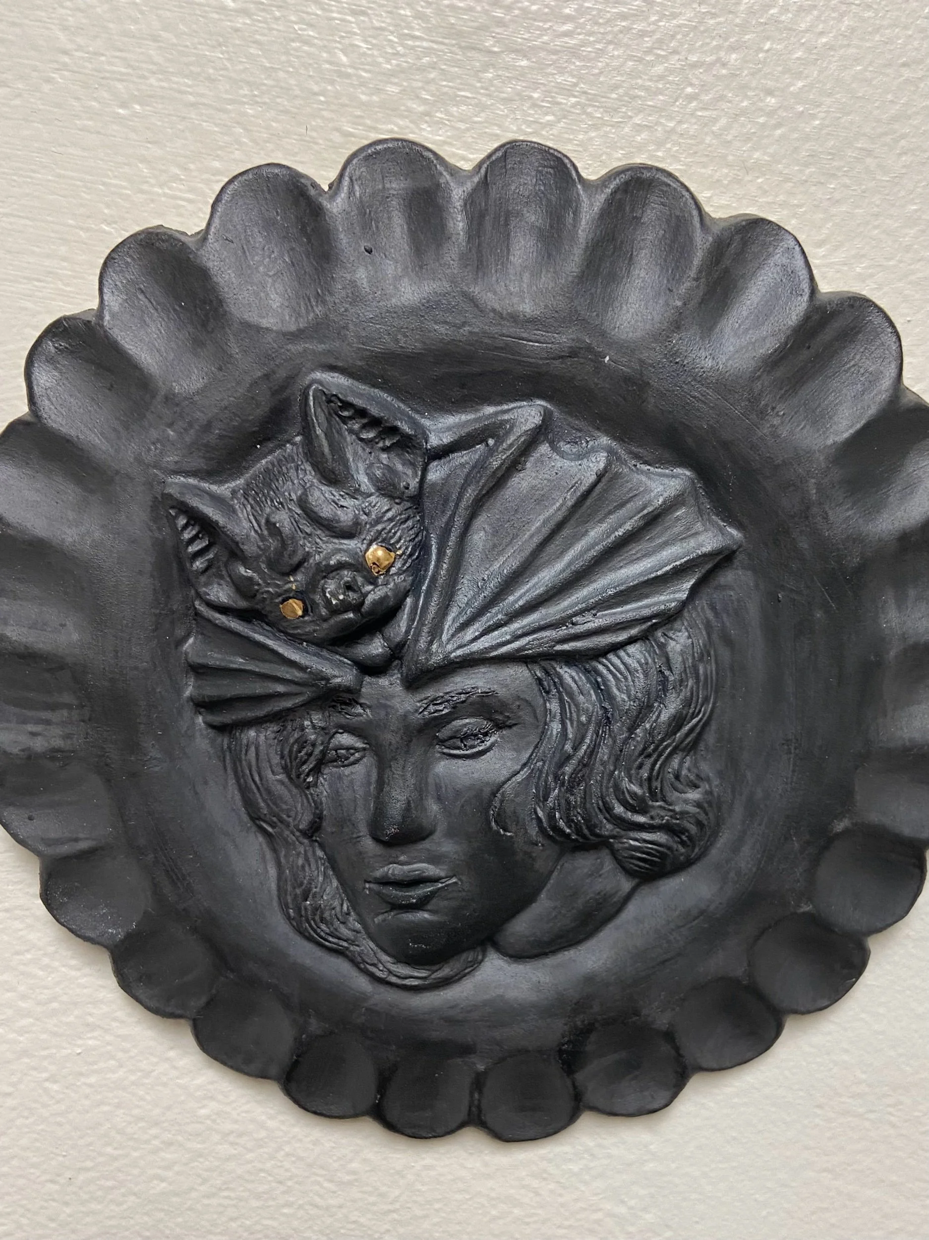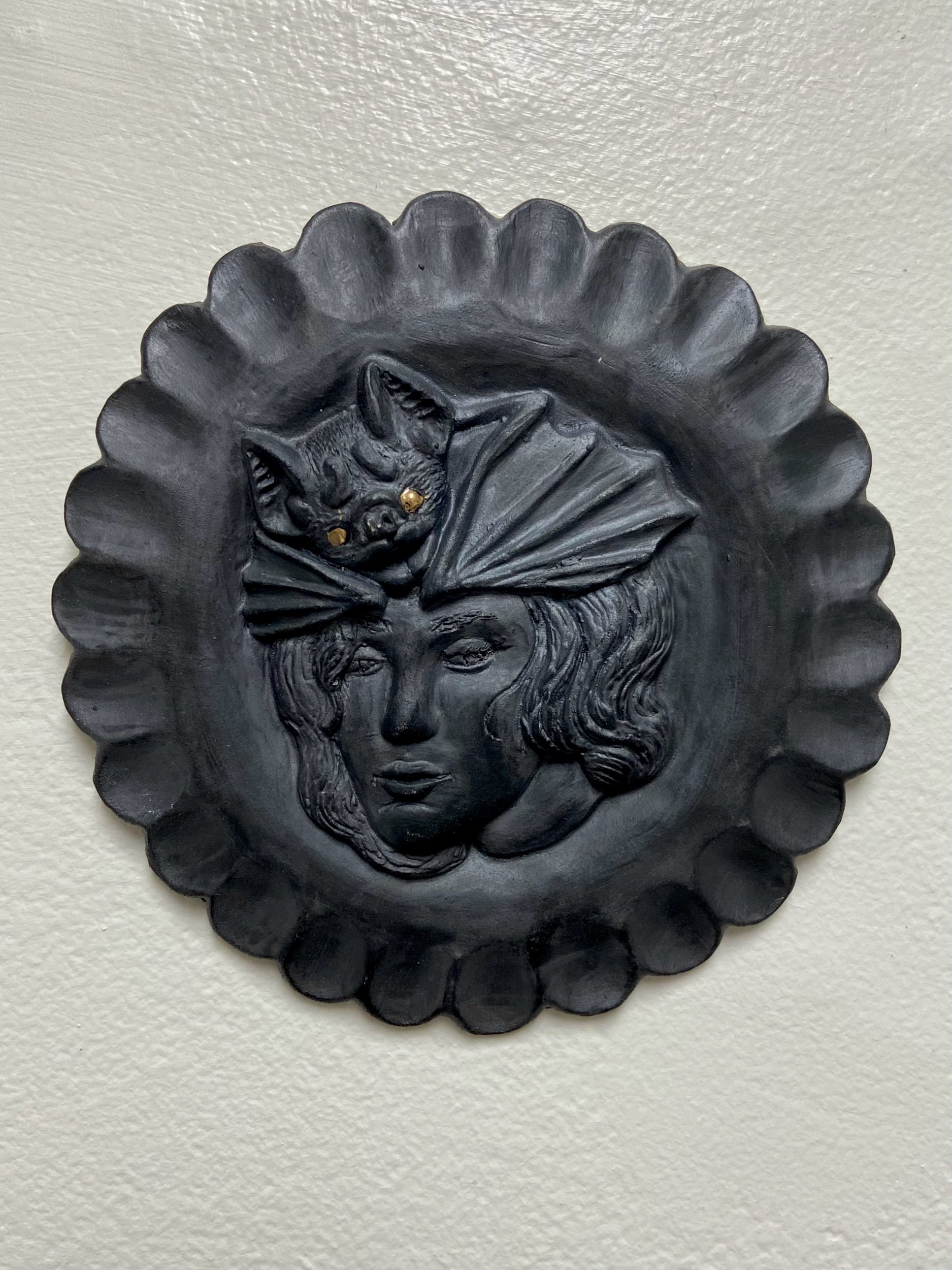 Store › Bats For Brains Lady 08 Image 1 of 2 Image 2 of 2 Bats For Brains Lady 08 $100.00 Cone 10 Porcelain wall hangings with gold luster bat eyes.5” Dia. x 0.5”H Quantity: Add To Cart Added! Cone 10 Porcelain wall hangings with gold luster bat eyes.5” Dia. x 0.5”H