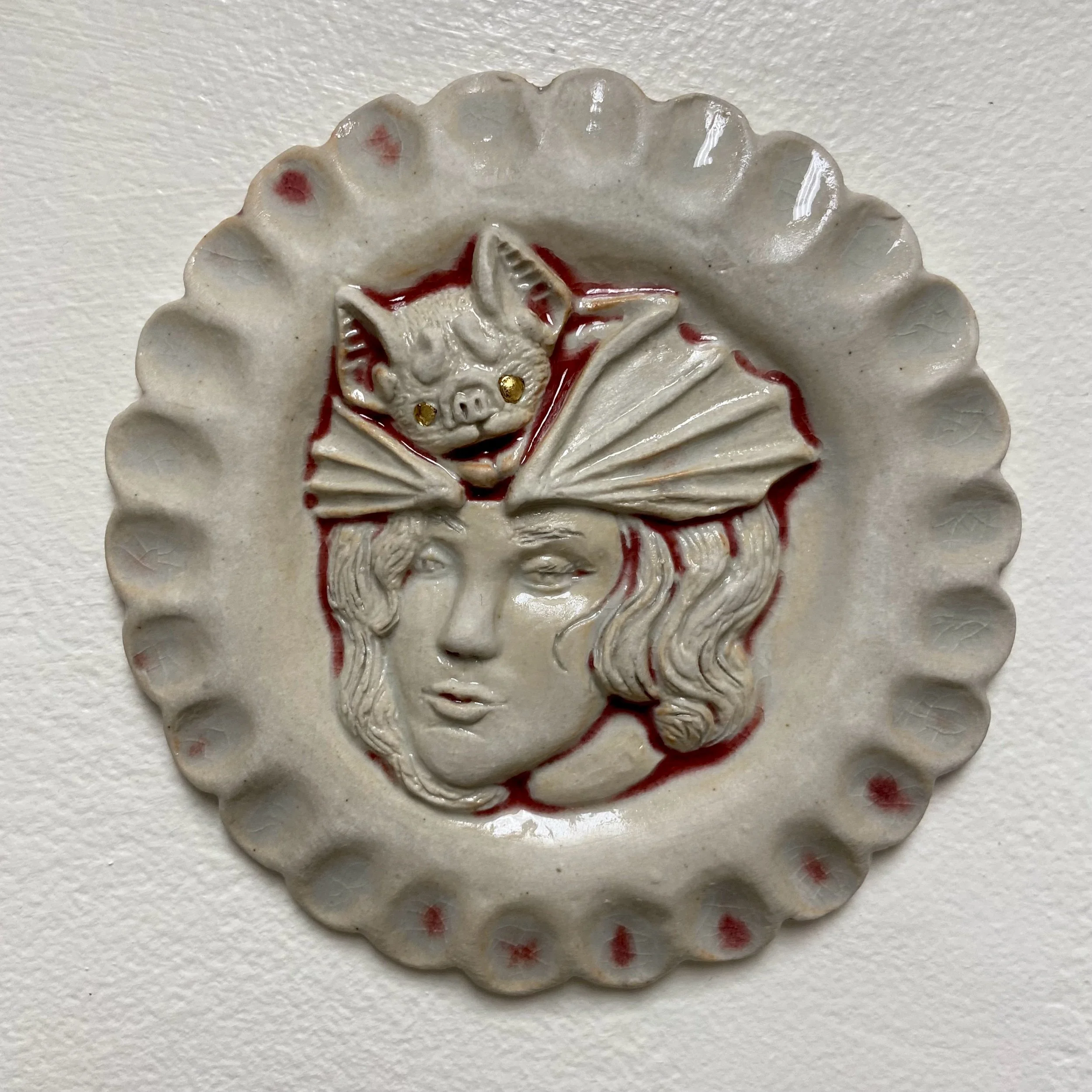 Store › Bats For Brains Lady 11 Image 1 of 2 Image 2 of 2 Bats For Brains Lady 11 $100.00 Cone 10 Porcelain wall hangings with gold luster bat eyes.5” Dia. x 0.5”H Add To Cart Added! Cone 10 Porcelain wall hangings with gold luster bat eyes.5” Dia. x 0.5”H