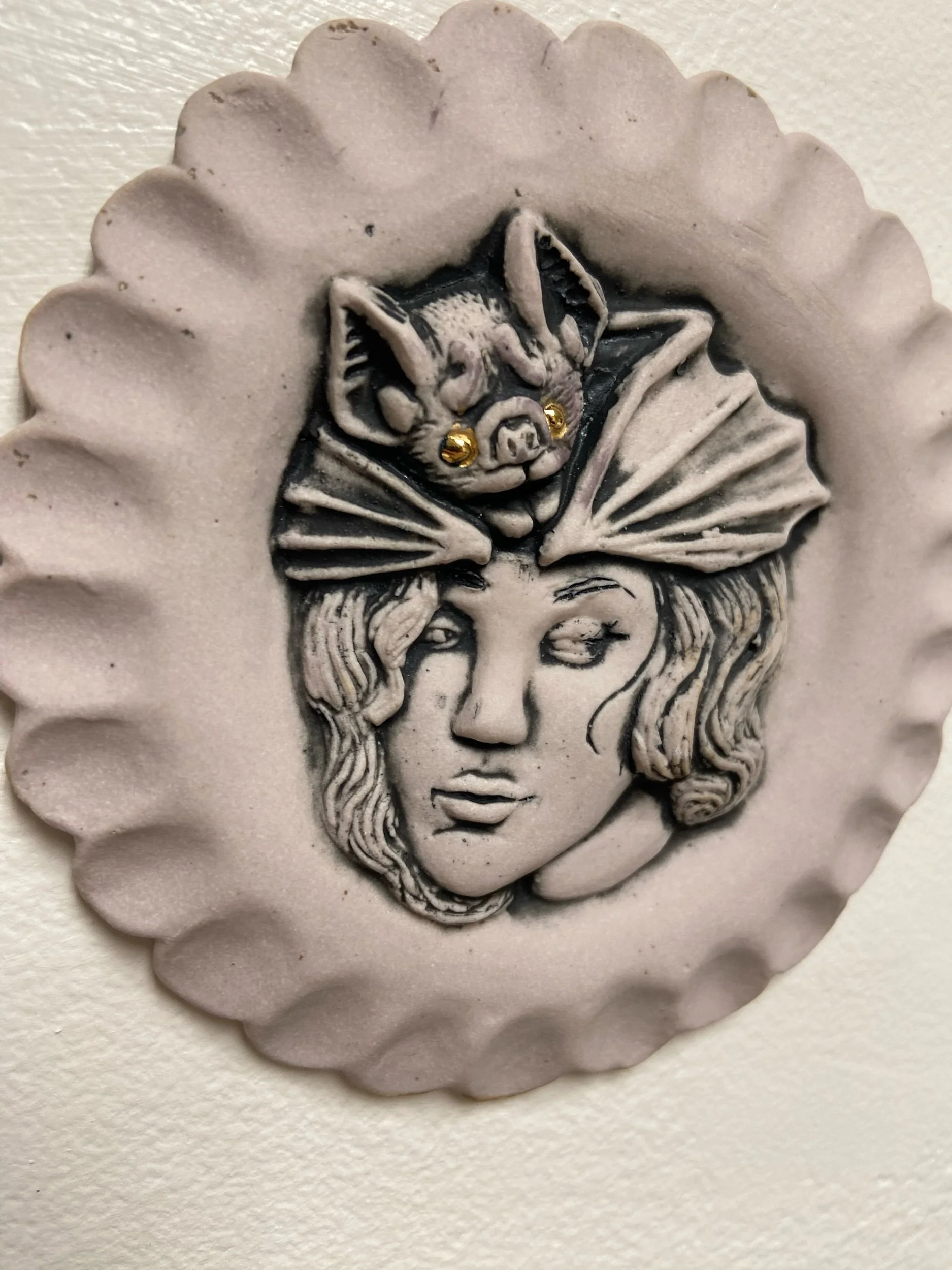 Store › Bats For Brains Lady 15 Image 1 of 2 Image 2 of 2 Bats For Brains Lady 15 $100.00 sold out Cone 10 colored porcelain wall hangings with gold luster bat eyes.5” Dia. x 0.5”H Sold Out Added! Cone 10 colored porcelain wall hangings with gold luster bat eyes.5” Dia. x 0.5”H