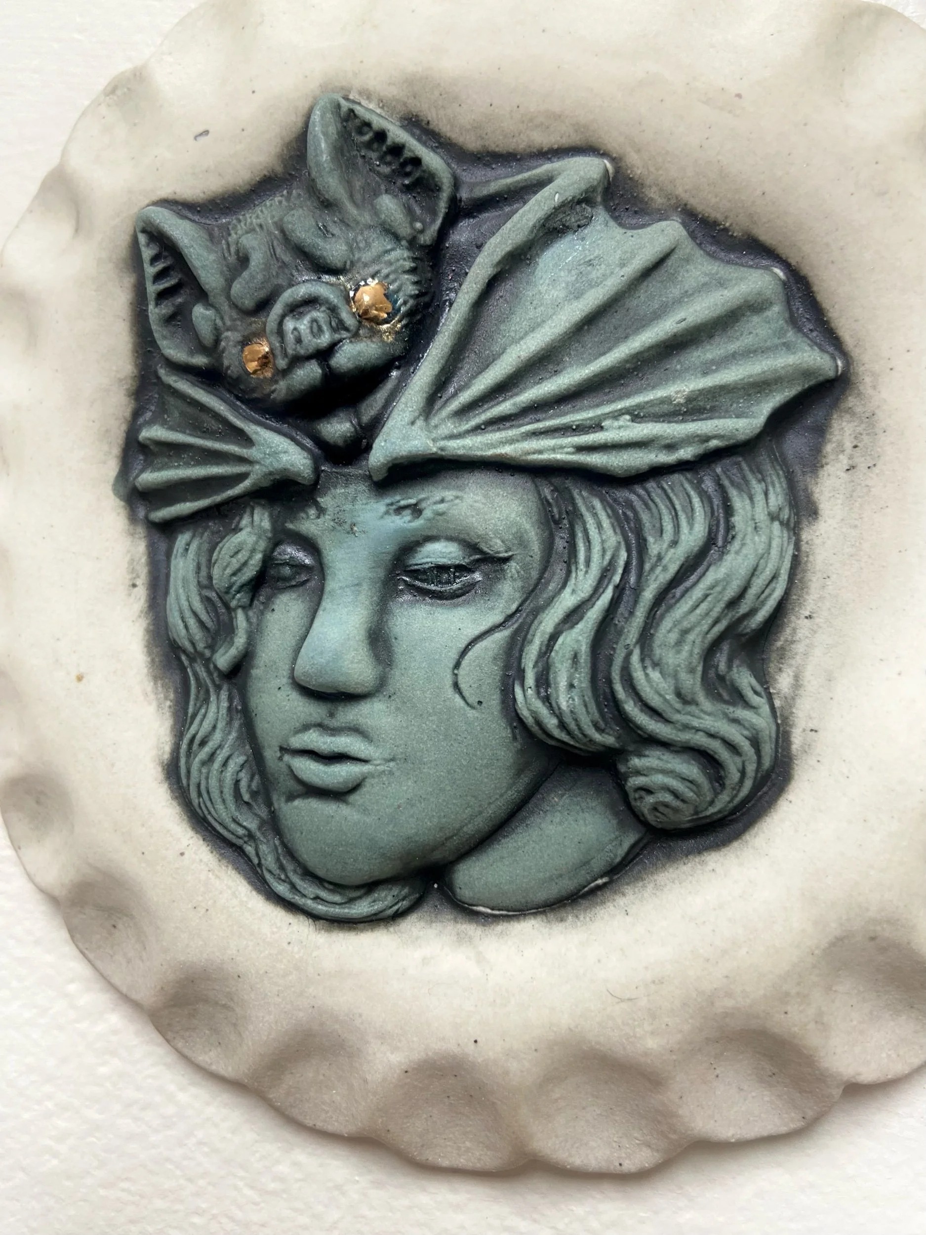 Store › Bats For Brains Lady 20 Image 1 of 2 Image 2 of 2 Bats For Brains Lady 20 $100.00 Cone 10 colored porcelain wall hangings with gold luster bat eyes.5” Dia. x 0.5”H Add To Cart Added! Cone 10 colored porcelain wall hangings with gold luster bat eyes.5” Dia. x 0.5”H