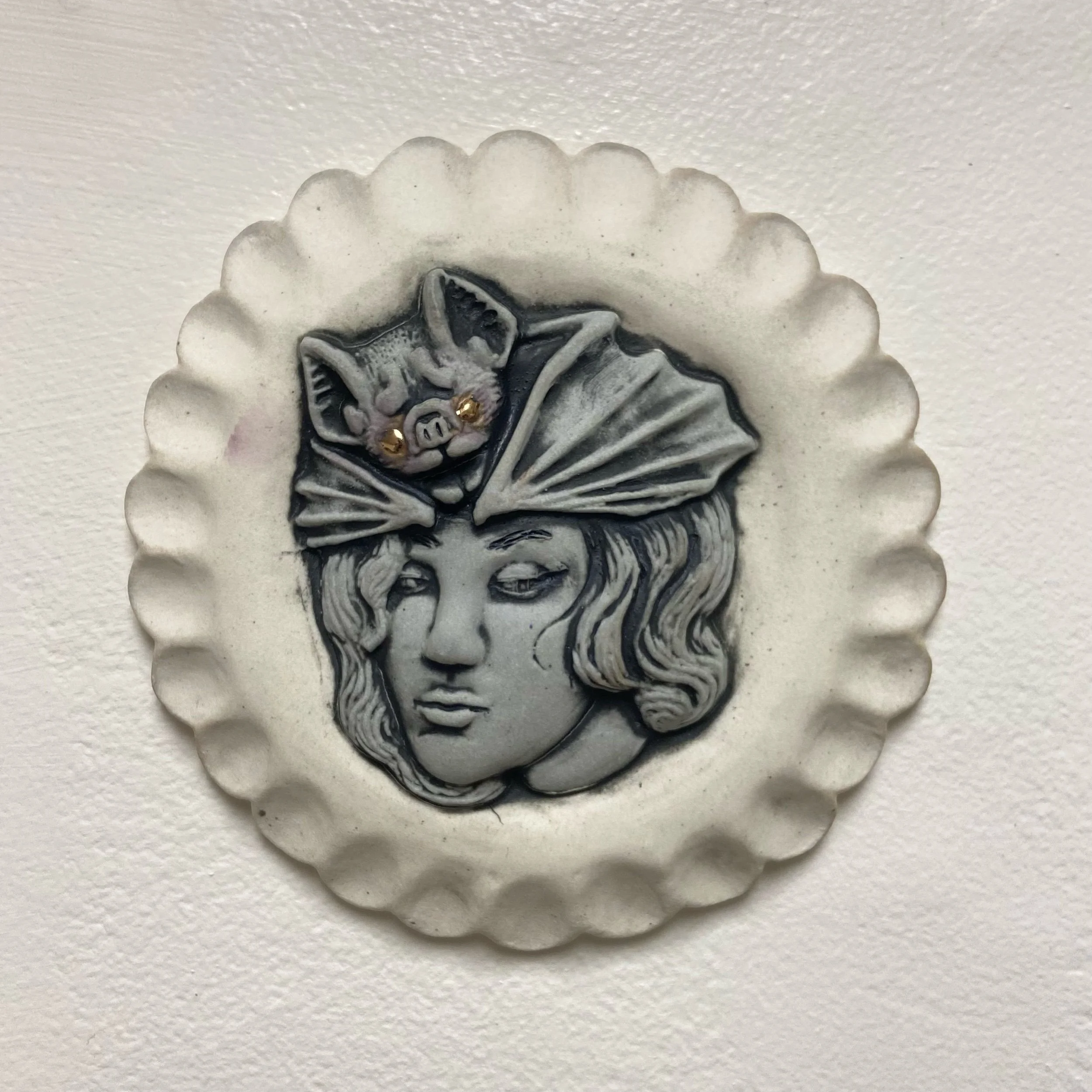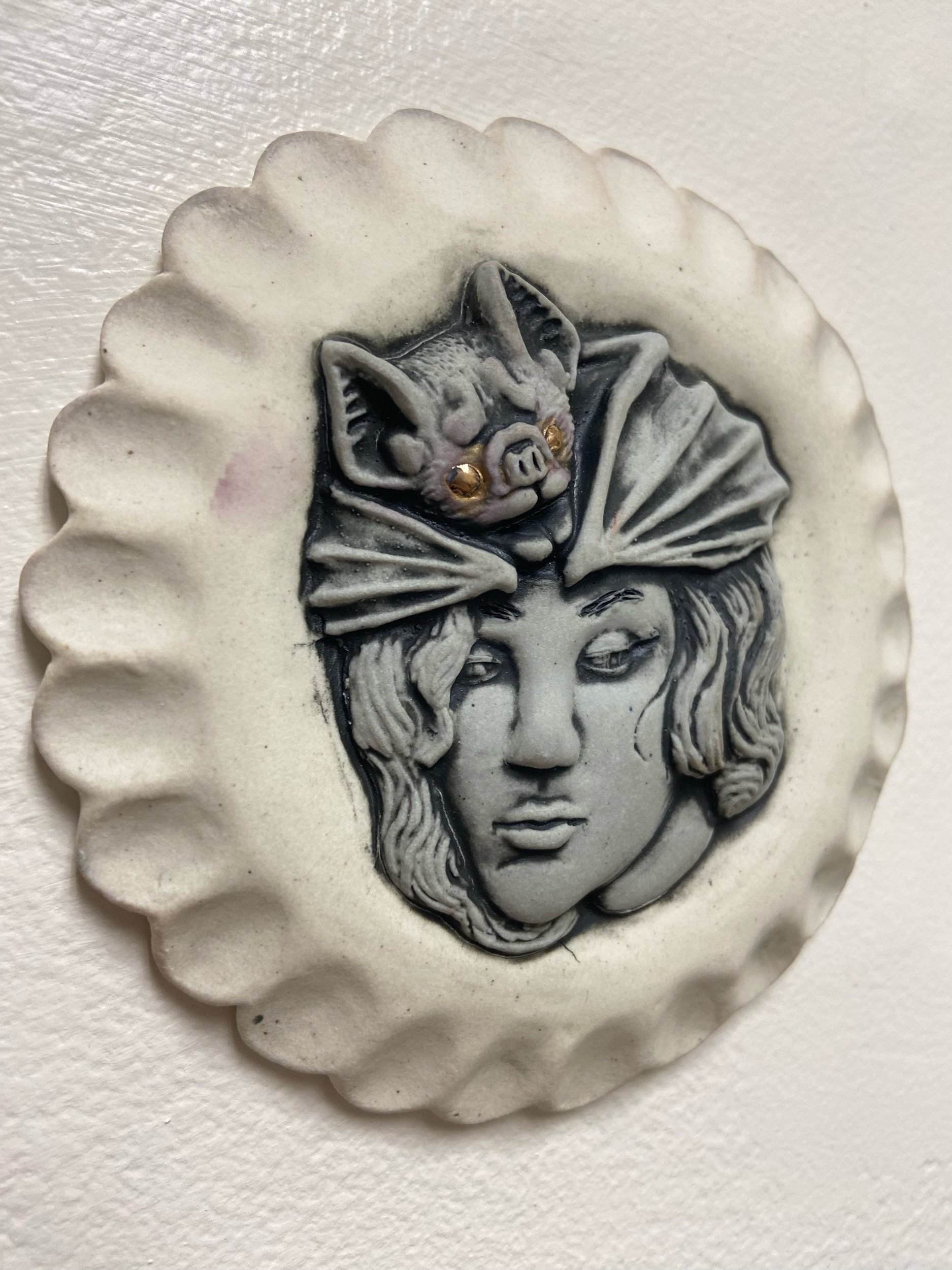 Store › Bats For Brains Lady 19 Image 1 of 2 Image 2 of 2 Bats For Brains Lady 19 $100.00 Cone 10 colored porcelain wall hangings with gold luster bat eyes.5” Dia. x 0.5”H Add To Cart Added! Cone 10 colored porcelain wall hangings with gold luster bat eyes.5” Dia. x 0.5”H